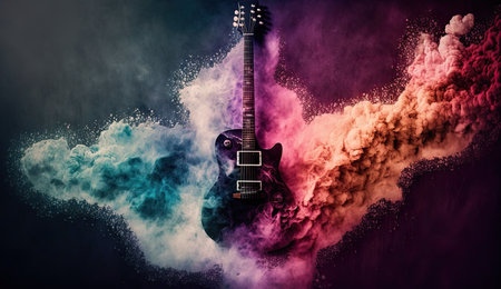 Electric guitar photo made of colorful dust clouds background