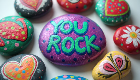A collection of beautifully painted rocks showcases a central purple stone boldly declaring You Rock in bright green letters. Surrounding it are various colorful designs, including hearts, flowers, and butterflies, creating a cheerful and uplifting atmosphere.