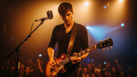 Musician passionately playing electric guitar during a live concert, illuminated by vibrant stage lights