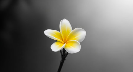 A striking of a single, delicate plumeria flower with vibrant yellow petals at the center fading to white at the edges. The flower is presented against a softly blurred grayscale background, creating a strong contrast that makes the colorful bloom stand out. The stem is visible below the flower. This composition emphasizes the natural beauty and elegance of the flower, offering a sense of tranquility and purity. The selective color technique draws the viewer's eye directly to the