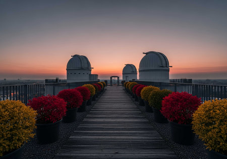 a rooftop observatory garden at sunset with telescopes, flowers, and a wooden walkway offers a peaceful and scenic view of the city.