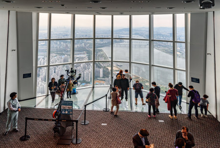Seoul, South Korea - October 13, 2017: Top view of tourists taking pictures on transparent glass floor of the Seoul Sky observation deck of Lotte World Tower. Amazing view from the skyscraper.