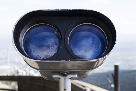 Metal grey coin operated telescope isolated at beautiful summer panoramic view at cityscape