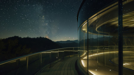 Modern circular building with glass walls offering breathtaking view of starry night sky