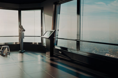 Prague, Czech - February 2023. Observatory deck in Zizkov TV Tower. Binoculars