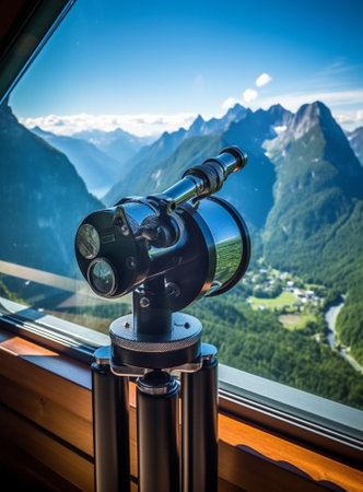 A curious woman uses a telescope to observe a stunning landscape with majestic mountains