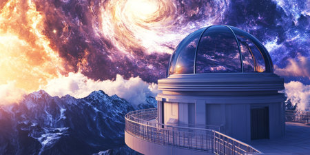 A sci-fi 3D background depicting a futuristic observatory with a massive transparent dome overlooking a swirling nebula. The advanced technology and cosmic view create a breathtaking sense of wonder.