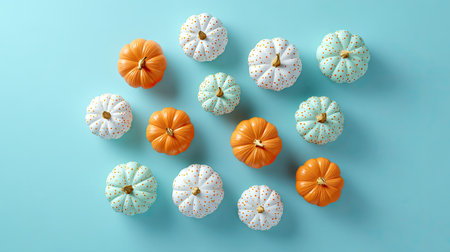 A vibrant arrangement of colorful pumpkins in orange, teal, and white on a solid blue background. Perfect for seasonal decorating and festive celebrations during fall.