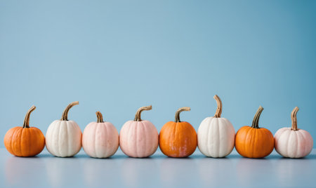 Colorful pumpkins in a row symbolizing creativity and festivity for seasonal themes. Generated A.I.