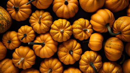 Many small orange pumpkins on black background top view. Orange vegetables on black banner with copy space. Autumn seasonal food