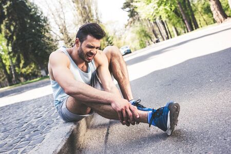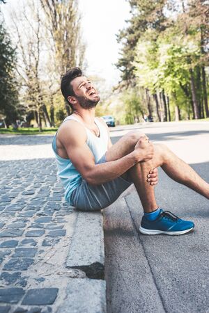 Injured sportsman suffering from pain while sitting on pavement border and touching leg