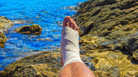 Foot injury, broken leg wrapped in a bandage while on vacation, bicycle accident and broken bones on vacation