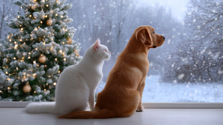 A charming scene featuring a dog and a cat sitting side by side by a window, watching snowfall outside while a beautifully decorated Christmas tree adds warmth to the indoor setting.