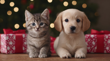 This heartwarming image features a cute kitten and an adorable puppy sitting side by side in front of colorful holiday gifts, creating a joyful festive scene.