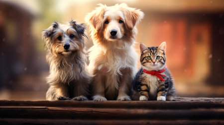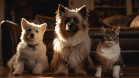 adorable cat and two dogs together in city apartments. animal friendship. generative AI.