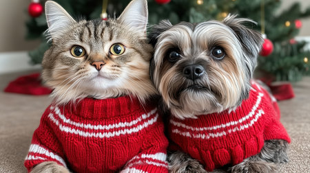 Cozy cat and dog wearing matching red sweaters, sitting together in front of festive Christmas tree adorned with ornaments. Their adorable expressions bring warmth and joy to holiday season.