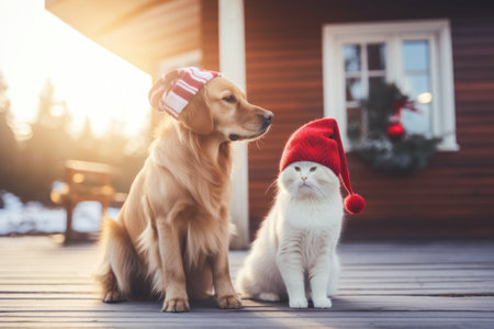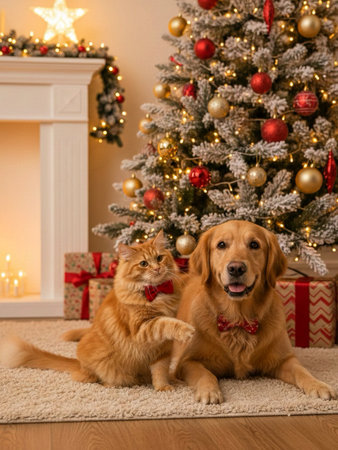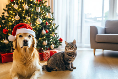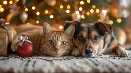 New Year. Golden retriever and playful tabby cat are happily posing in a festive holiday atmosphere, with colorful ornaments and decorations creating a joyful celebration scene