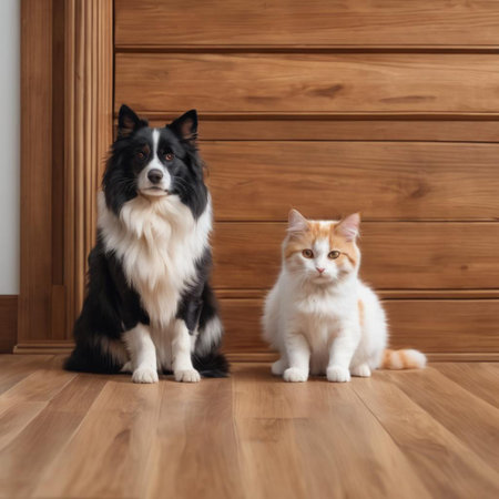 Adorable dog and cat sitting on wooden background. Friendship concept.