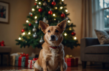AI Generated. Dog sitting near dropped christmas tree in living room Guilty puppy