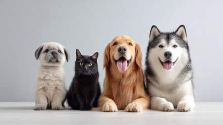 Different types of pets including a puppy, a black cat, a golden retriever, and a husky sitting together, creating a beautiful display of interspecies friendship and togetherness