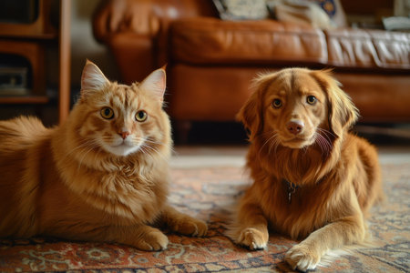 An orange cat and a dog are lying calmly on a colorful rug. The cozy living room features a brown leather couch and warm lighting. They appear relaxed and comfortable in each other's company.