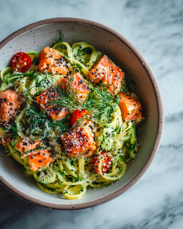 Spaghetti pasta with pesto sauce and salmon - Italian food style