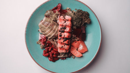 Freshly cooked salmon with vibrant sauce served in a restaurant
