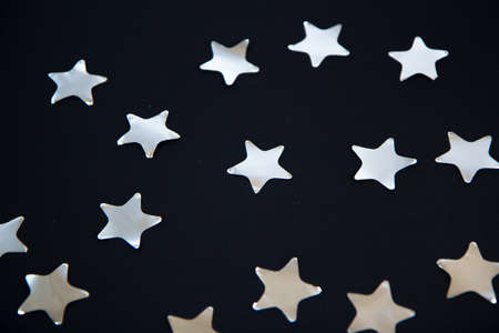 Golden shining stars on sparkly black festive background. Stylish modern Christmas decorations. New year party details. Selective focus.
