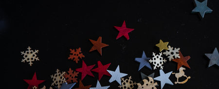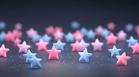 Scattered colorful pastel stars on a dark surface create a playful and dreamy atmosphere. Ideal for backgrounds or themed decorations in various creative projects.