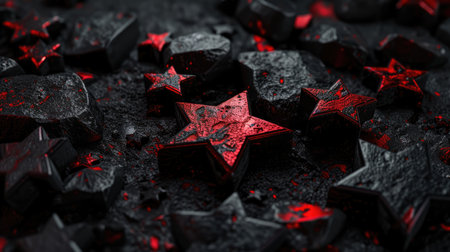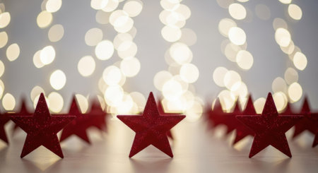 A close-up shot of red stars arranged on a light surface, with a bokeh effect in the background, creating a festive and celebratory atmosphere.