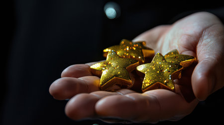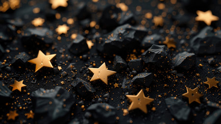 Close-up of shiny gold stars resting on a textured dark surface, symbolizing achievement and luxury.