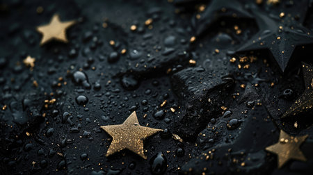 Golden stars scattered on a black stone surface with a golden glitter background.