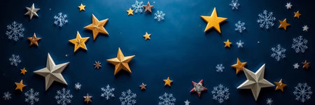 A stunning array of shimmering golden stars is artfully scattered across a rich blue backdrop, creating a magical and festive atmosphere. The interplay of light and shadow enhances the enchanting scene, inviting viewers to dream and celebrate.