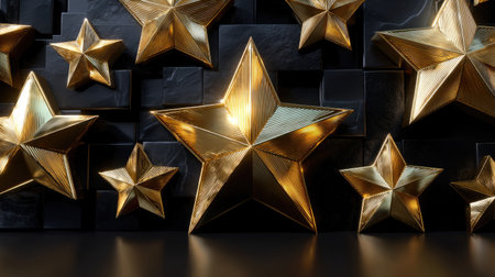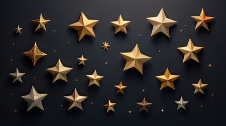 This image features an artistic arrangement of golden three-dimensional stars on a sleek black background. The piece radiates elegance and modern charm, ideal for contemporary decor.