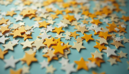 A vibrant array of star-shaped confetti in shades of yellow, white, and cream creates a playful and festive atmosphere against a soothing blue backdrop. This delightful scene evokes feelings of celebration and joy, perfect for party invitations or festive decorations.