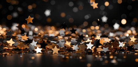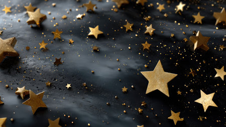A dazzling array of shimmering golden stars and confetti glimmers against a deep, dark background, creating a festive and celebratory atmosphere. This enchanting scene captures the essence of joy and celebration, perfect for New Years Eve or any special occasion.