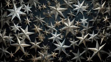 A mesmerizing array of black star-shaped confetti glimmers softly against a deep, shadowy background. This enchanting image evokes a sense of mystery and celebration, perfect for adding a touch of elegance to any design project.