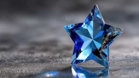A close-up captures a translucent blue crystal star with multiple facets. The star sits on a textured gray surface with soft lighting. The image showcases geometric shapes and color gradients, offering potential for commercial applications. This versatile image could be used for various design projects.