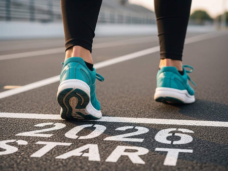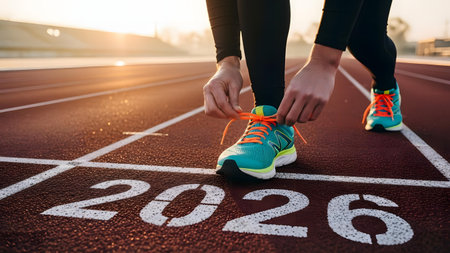 New 2026 Year. Woman in starting position at stadium, closeup. Numbers and words Start on road