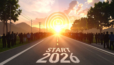 A solitary figure stands in a vast, open field at sunset, gazing at the large, illuminated numbers spelling out '2026' and the word 'START'