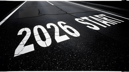 White numbers 2026 and word START painted on a dark asphalt road. Clear details...