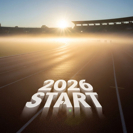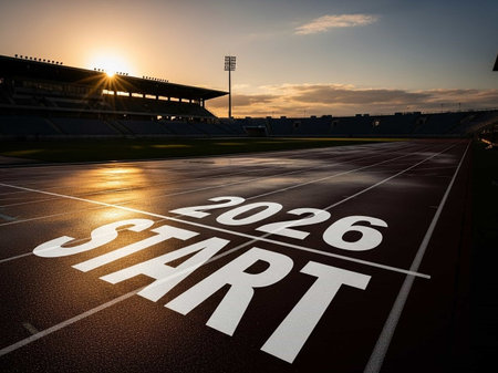 Running track for new year 2026 with sunrise sky background and copy space