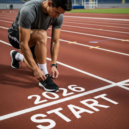 Athlete in starting position on running track with START 2026 text, symbolizing new beginnings, resolutions, motivation, and fresh goals for the year 2026. Perfect for business, sports, or self-improvement themes.