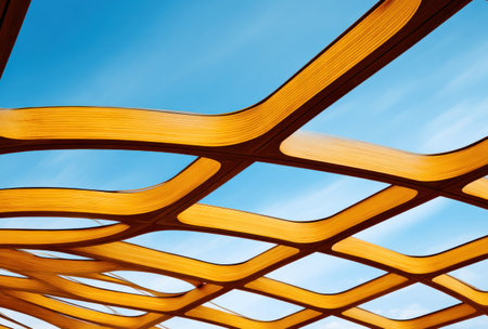 Low-angle shot of an organic wooden beam structure against a bright, clear blue sky