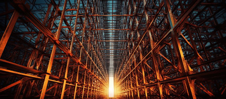 Captivating perspective view of an industrial framework with vivid red elements, leading to a bright light source at the center. A striking architectural composition.