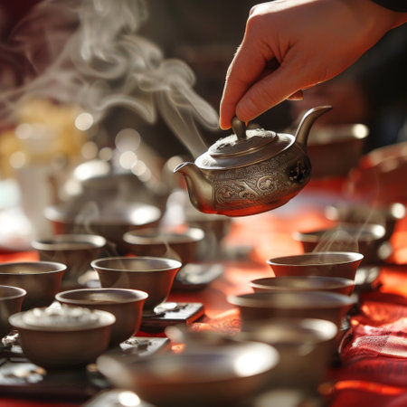 The warmth of a cultural ritual captured as hot tea flows from a decorative kettle into earthen cups.