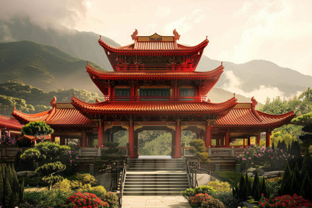 Majestic chinese temple stands tall on a mountainside, its vibrant red hues contrasting beautifully with the lush greenery and colorful flowers that surround it