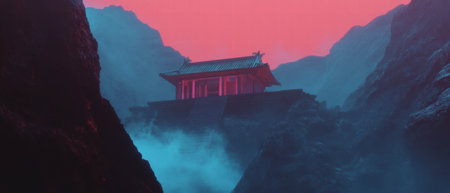 Buddhist temple perched in the mountains with serene red hues reflecting spirituality