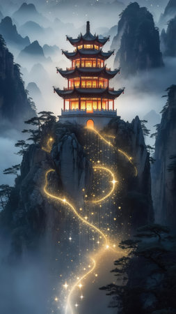Majestic traditional Chinese pagoda illuminated at night on a misty mountain with glowing magical light trails and starry effects.