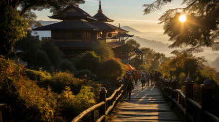 Scenic view of two pagodas at sunset with people walking along a wooden path surrounded by lush greenery and misty mountains in the background.